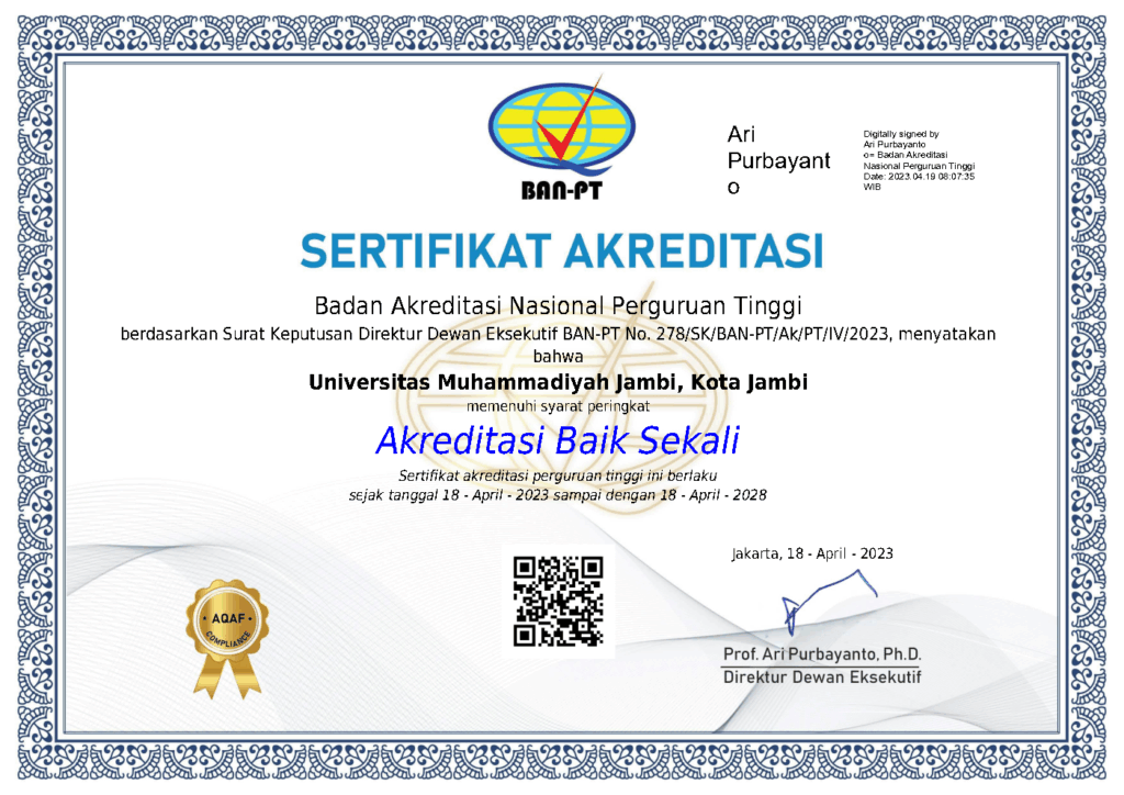 Universitas Muhammadiyah Jambi berhasil meraih predikat Akreditasi Baik Sekali dari lembaga akreditasi resmi, sebuah pencapaian yang mencerminkan komitmen tinggi dalam menjaga mutu pendidikan, kualitas pengajaran, serta tata kelola yang profesional.
